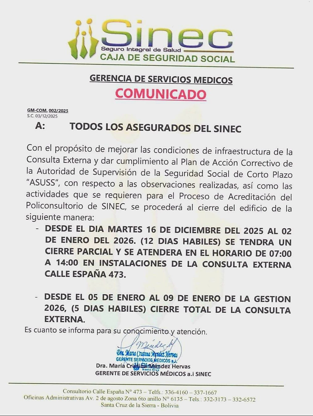 ¡IMPORTANTE! AVISO DE CIERRE PARCIAL DE CONSULTA EXTERNA. 10/12/2024